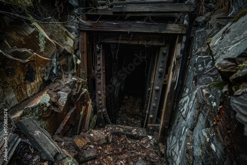 © anatolir, Obraz premium Forsaken mine entrance with dilapidated wooden beams set in a rugged landscape
