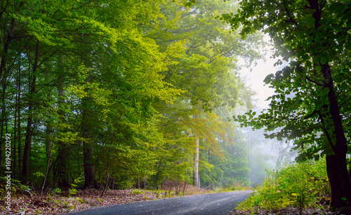 Fototapeta premium Forststraße im Nebel , Wald am Morgen