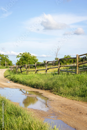 Obraz premium Forststraße mit einer Wasserpfütze und einem Weidezaun blauer Himmel und Wolken