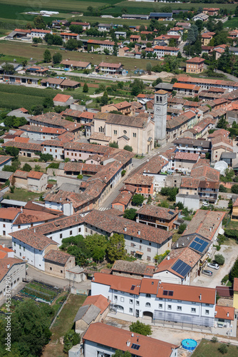 © s-aznar, Fototapeta premium Fotografía aérea de la iglesia y centro urbano de un pueblo de la comarca de Pordenone, Italia