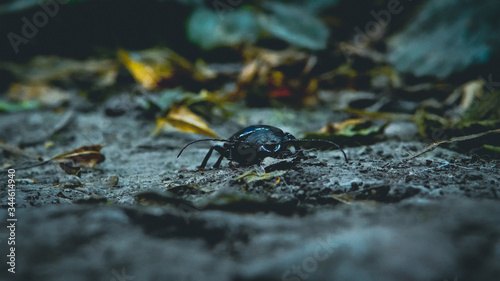 Fototapeta premium Fotografía Macro de un escarabajo negro que camina a paso lento mientras...
