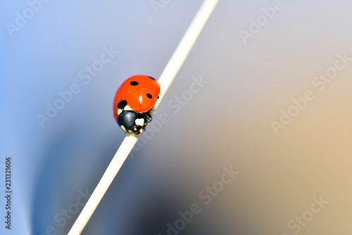 © vrej, Obraz premium Fotografia makro z biedronką na niebieskim tle.