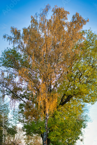 © Maximilian, Fototapeta premium Fotografie von einem Baum im Herbst mit gelben, herabfallenden Blättern.