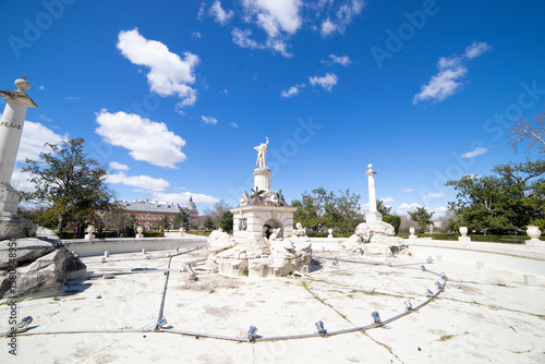 © Outsiderzone, Fototapeta premium Fountain in Aranjuez, Spain surrounded by clear skies and historical architecture during a sunny afternoon