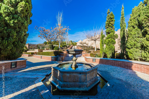 Obraz premium Fountain in the Alcazaba garden in Almeria Spain on a wonderful and sunny day with a blue sky