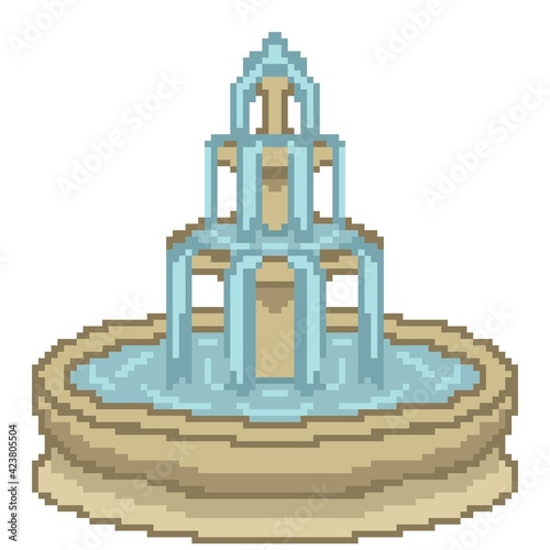 © Sudakarn, Naklejka premium Fountain pixel art. Fountain cartoon. Pixel art fountain. Icon Fountain.