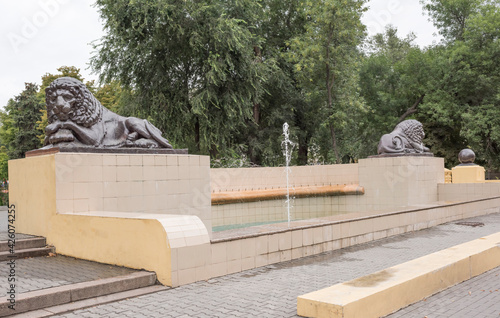 © Aleksandr, Obraz premium Fountain with lions sleeping in cloudy weather in Rostov-on-Don