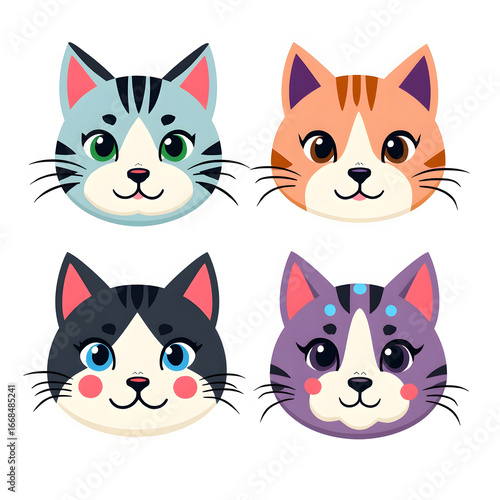 © Yasin, Fototapeta premium Four adorable cartoon cat faces with unique colors and happy expressions are presented.