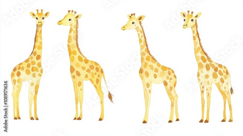 © Newstep, Obraz premium Four adorable giraffes standing gracefully, showcasing their distinct patterns and stature in a whimsical, artistic style.