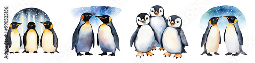 Fototapeta premium Four adorable penguins in various poses, showcasing their charm and...