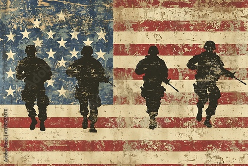 © Alex, Fototapeta premium Four Armed Soldiers Silhouetted Running Over American Flag Background
