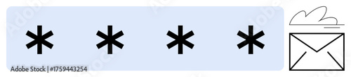 Obraz premium Four asterisks representing a password, a blue background, and an email envelope suggest encryption. Ideal for cybersecurity, communication, technology, data privacy, cloud storage, authentication