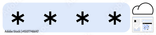 Obraz premium Four asterisks symbolize password protection, accompanied by a cloud and a dashboard interface showcasing analytics. Ideal for security, cloud storage, analytics, privacy, encryption, data