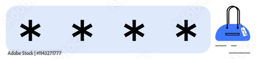 Fototapeta premium Four asterisks within a rectangular field indicating hidden password, next to a blue padlock icon. Ideal for security, login screens, data privacy, authentication, access control, user interface
