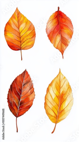 © fotofabrika, Obraz premium Four beautifully illustrated autumn leaves showcasing vibrant red and orange hues against a clean white background