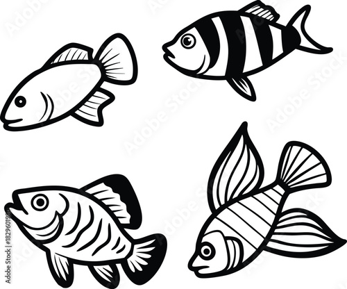 Fototapeta premium Four black and white cartoon fish illustrations animal