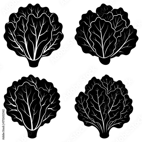 Fototapeta premium Four black and white stylized lettuce heads with detailed leaf veins arranged...