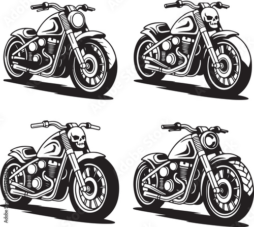 Obraz premium Four black and white vector illustrations of custom motorcycles with skull...