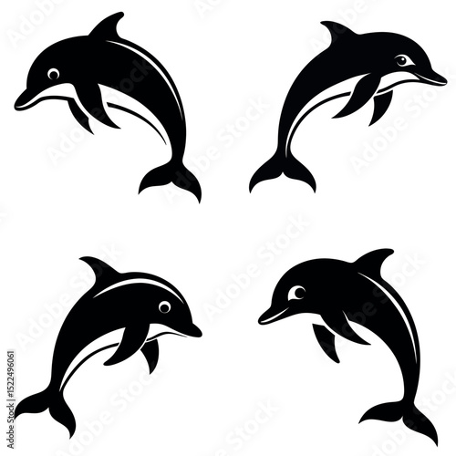 Naklejka premium Four Black Dolphin Silhouettes in Leaping Poses, Illustration on White...