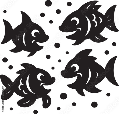 Fototapeta premium Four Black Fish Silhouettes Swimming Among Bubbles