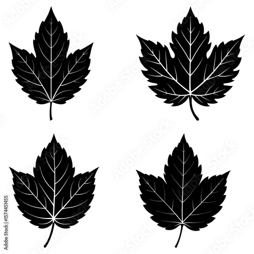 Fototapeta premium Four black maple leaf silhouettes with detailed veins arranged on a white...