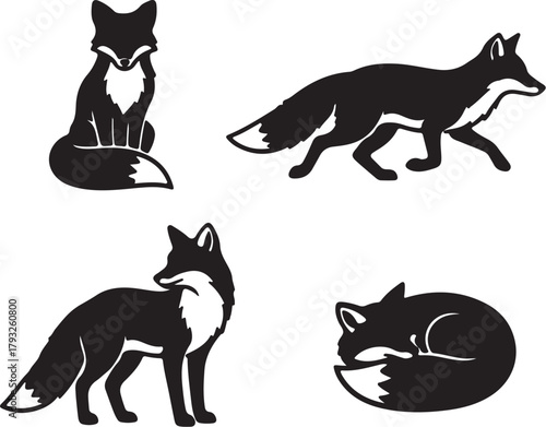Fototapeta premium Four black silhouette illustrations of foxes in different poses vulpine...