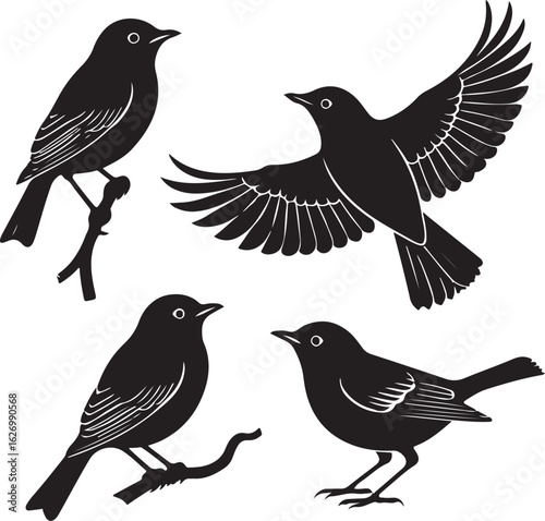 © grapxitbd, Fototapeta premium Four black silhouettes of birds in various poses on a white background flying