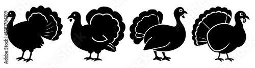 © Abul, Fototapeta premium Four black silhouettes of turkeys standing in a row on a white background