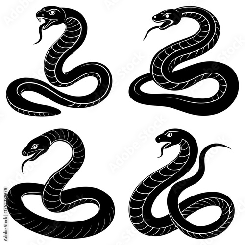 © Lutfor, Fototapeta premium Four black snakes with forked tongues in various poses on a white background illustration style drawing