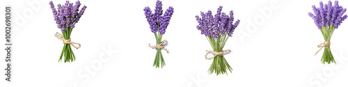 © DesignVectX, Naklejka premium Four bundles of fresh lavender flowers tied with twine on a transparent background, showcasing natural beauty and vibrant purple hues