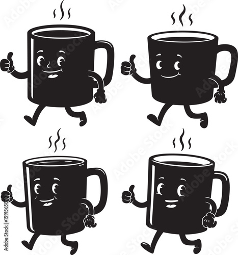 Obraz premium Four cartoon coffee cups with faces and thumbs up silhouette