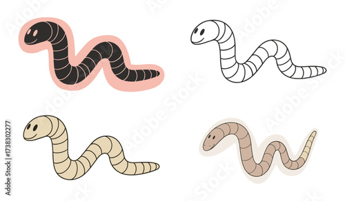 Fototapeta premium Four cartoon earthworms in different colors and styles on white background...