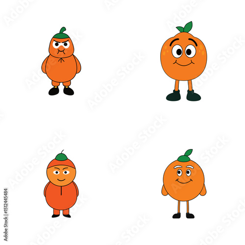 © Asaduzzaman, Obraz premium Four cartoon oranges with different expressions standing on a white background in a square layout