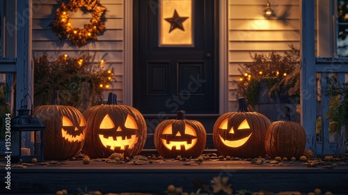 © Alloca Design Studio, Obraz premium four carved pumpkins sitting on a front porch at night.