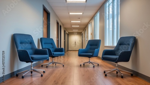 © Artem, Fototapeta premium Four chairs in office hallway with custom text space