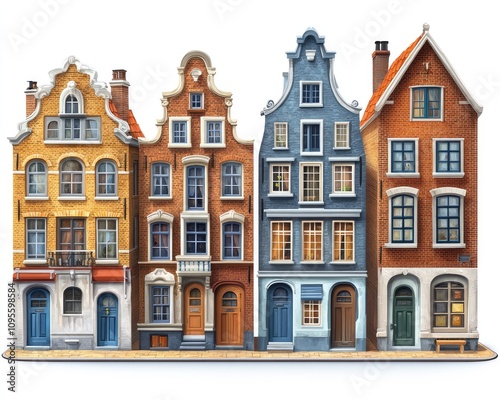 © Lhouis, Fototapeta premium Four charming European buildings stand side by side. This image is perfect for travel, real estate, or architecture themes.