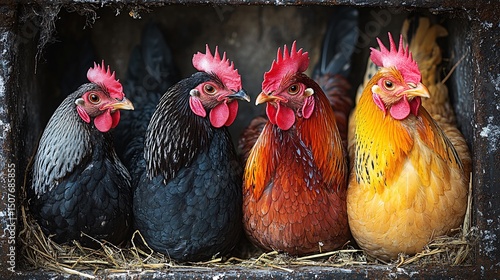 Fototapeta premium Four Chickens in a Wooden Coop Black, Brown, Red, and Yellow Hens Resting in Hay
