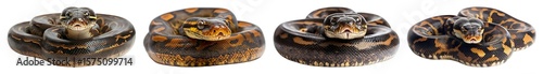 Fototapeta premium Four coiled pythons with dark and orange patterns on transparent background