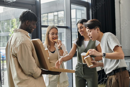 Obraz premium Four colleagues take a break from their work to enjoy pizza and coffee.