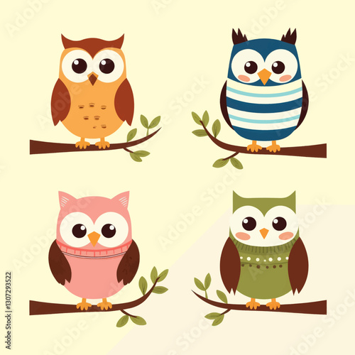 Fototapeta premium Four colorful cartoon owls on branches with leaves