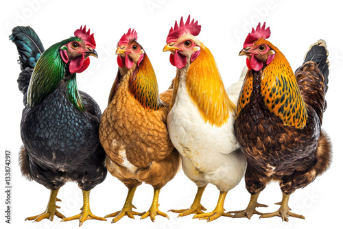 © Shanum, Fototapeta premium Four Colorful Chickens Standing Together in a Farmyard Setting