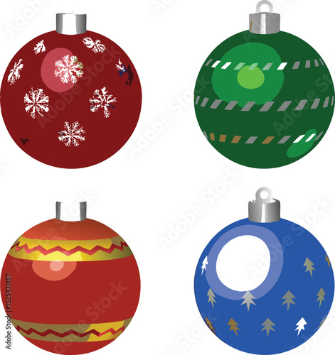 © Kingkor, Obraz premium Four Colorful Christmas Ornaments with Unique Designs on a White Background
