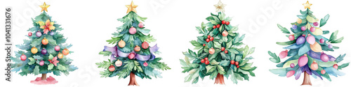 © WeeraWanderlust, Obraz premium Four colorful Christmas trees with festive decorations on a white isolated background.