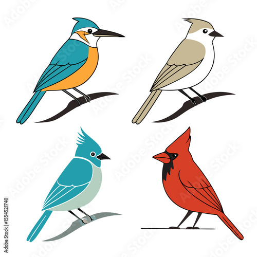 Fototapeta premium Four colorful flat design birds perched on branches kingfisher cardinal