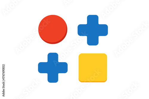 © Georgy, Obraz premium Four colorful geometric shapes including a circle, square, and two plus signs on white background