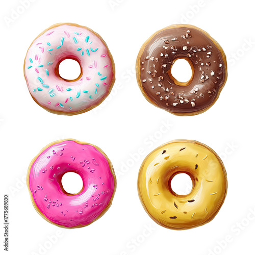 Fototapeta premium Four colorful glazed donuts, top view