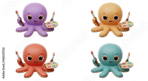 Naklejka premium Four colorful octopus figurines with paintbrushes and palettes