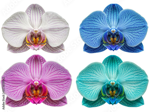 © Creative Design, Obraz premium Four colorful orchid flowers white blue pink and turquoise isolated on transparent background