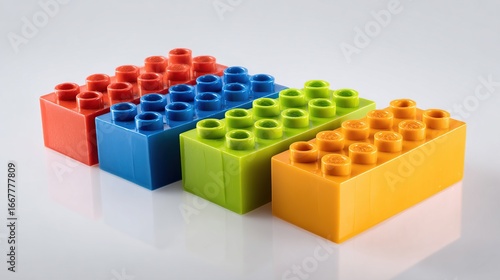© Udin, Obraz premium Four colorful plastic building blocks, red, blue, green, and orange, arranged in a row on a white reflective surface, showcasing their interlocking studs