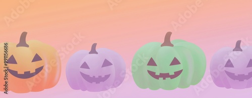 © Enigma, Fototapeta premium Four colorful pumpkins are lined up on a gradient background, creating a festive and playful halloween atmosphere. Perfect for projects related to halloween, autumn, or celebrations